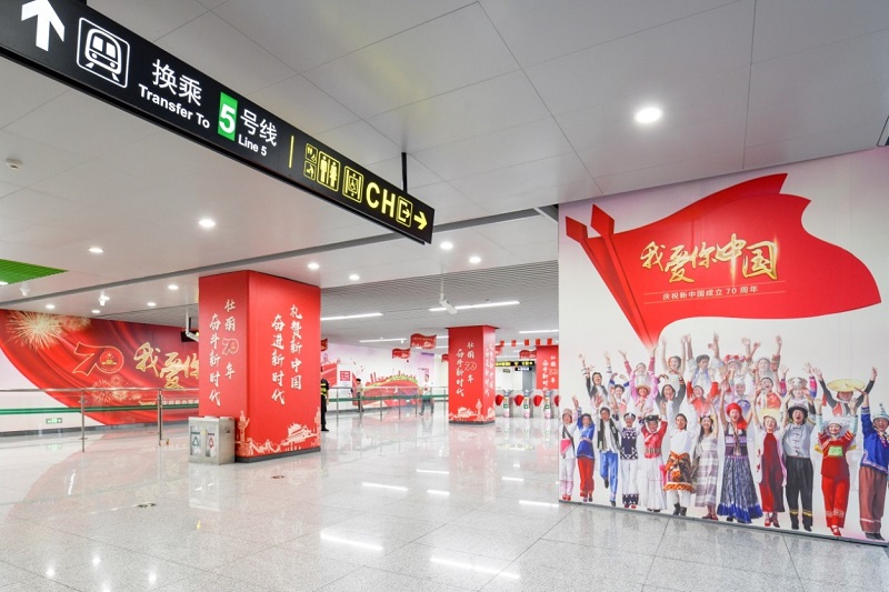 在新中國成立70周年之際,鄭州地鐵全線網(wǎng)打造主題車站、主題列車,清新簡約的主題設(shè)計,熱烈的中國紅元素將五一公園站及2號線部分列車裝飾一新、閃耀綠城。